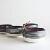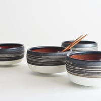 wheel thrown. glazed tomato red inside, partially unglazed exterior with matte black/brown with white abstract lines.