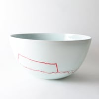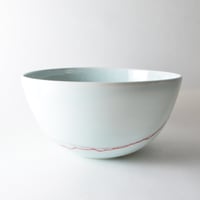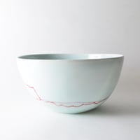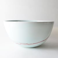 wheel thrown. glazed glassy clear blue with red graphic lines. soft, marbled whit interior.