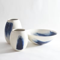 porcelain vase, glazed blue and clear. each vase has it's own unique markings, and shapes and size vary slightly. 2 sizes available.