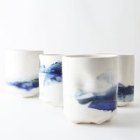 altered porcelain tumbler, glazed blue and clear. each tumbler has it's own unique markings, and shapes and size vary slightly. approx 2.5" x 3".