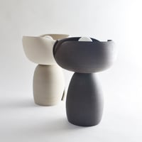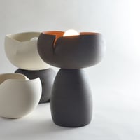 Dark brown stoneware asymmetrical light fixture, for use as a small table or accent light.